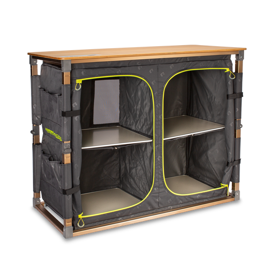 The Eco Fold Twin V2 features a naturally weatherproof and heat-resistant bamboo tabletop and rustproof aluminium frame. A perfect working surface to cook and prepare camp meals. The twin lower cupboards, along with side storage pockets, help to help keep your campsite organised. A retractable utility rack keeps utensils close at hand and can also store a basin for wash-up.