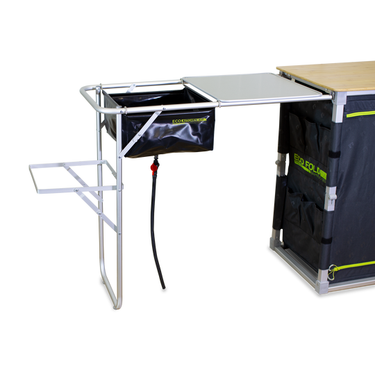 The Eco Kitchen Kit is a clever extension to your Eco Fold Twin, Single or Cupboard. With a side preparation table, sink, and handy bin holder it transforms your storage cupboard into a camping kitchen. Easy to attach to a newly purchased Eco Fold and can be retrofitted to older Eco Fold models by purchasing the Connector Set.