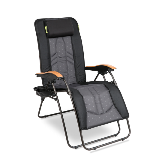 The Halo Lounger is built for the sleepy camper. The padded surface is suspended with an elastic cord on a durable steel frame, making it both supportive and comfortable. This chair can recline to any position and then securely lock into place with the levers found under each arm. The soft pillow slides up and down to suit users of all heights or to use as lumbar support.