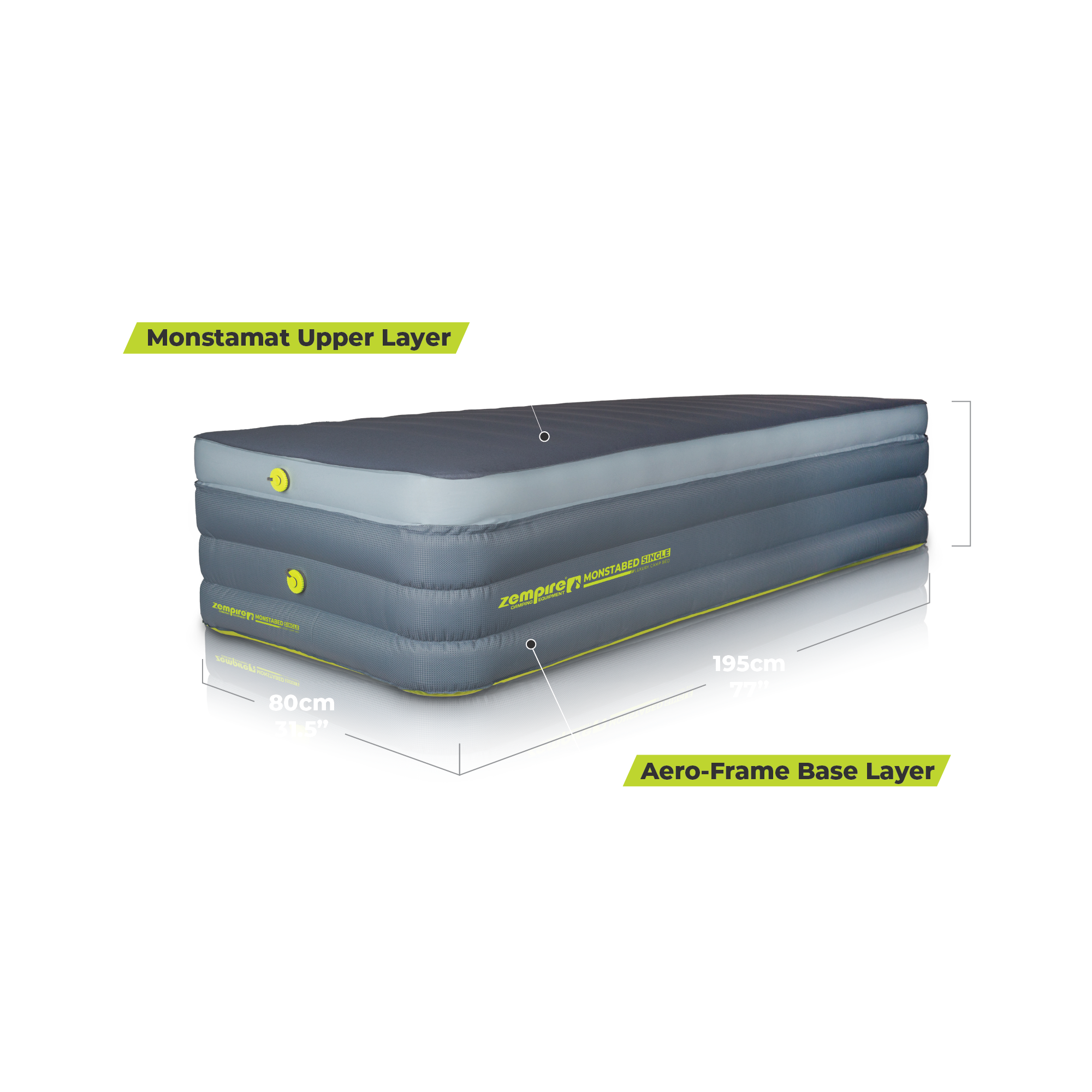 Monstabeds have two layers - an inflatable TPU coated air base and a Monstamat self-inflating foam upper. They combine the best of both worlds between a sleeping mat and an airbed at 42cm thickness.